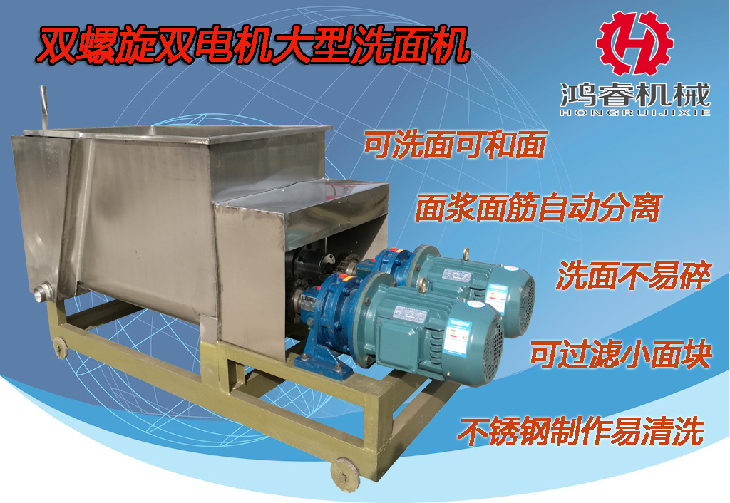 洗面機是不是越大越好呢?很顯然并不是,不管是做什么食品生意,每天基本上都會有個固定的產量、銷量,那么洗面機的大小就是直接和你每天的產量掛鉤的,有人就要想了,我涼皮每天涼皮面水需要20袋面,我直接買個20袋面的洗面機就型了,一次洗出來正好夠用,一次洗出來還省時間呢。這就大錯特錯了,現在是夏天,面水在炎熱的天氣特別容易發酵,如果你一次洗了20 袋面,用300斤每小時的涼皮機生產,需要將近8個小時,剛開始的面水和zui后面的面水相隔了8小時之久,越靠后的面水發酵的越厲害,涼皮就很容易出現質量問題,所以產量大得時候,就要把面粉按時間分批次洗,確保涼皮質量 。