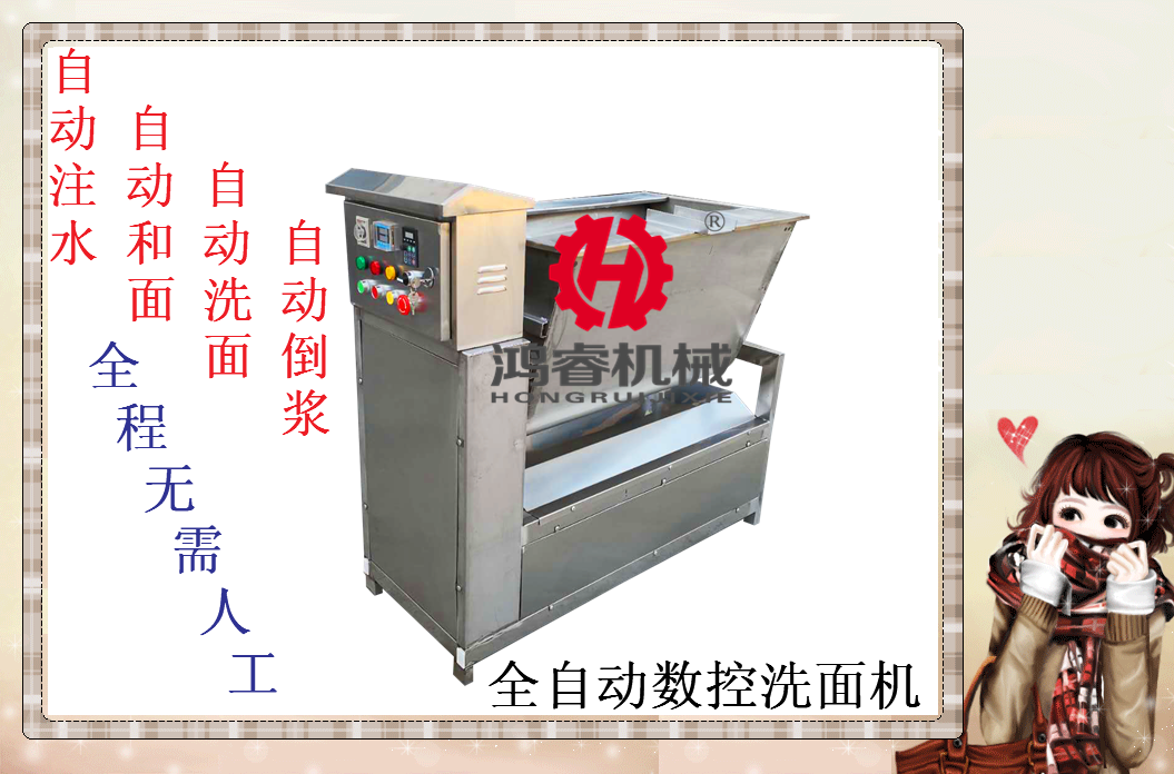 在制作涼皮的過(guò)程中,洗面是一項(xiàng)重體力勞動(dòng),特別是在冬天,冰冷刺骨的水使人無(wú)法承受。有了鴻睿新型洗面機(jī)可以使你不用再忍受用手洗面的煩惱,HC系列和面洗面機(jī)是我廠基于民間傳統(tǒng)制作涼皮的原理,開(kāi)發(fā)的一種新型生產(chǎn)設(shè)備,只需把面粉放入洗面機(jī),即可完成從和面---洗面的全部工序。避免了手工制作勞動(dòng)強(qiáng)度大、工序繁瑣、產(chǎn)量低、不衛(wèi)生等缺點(diǎn)。 新型洗面機(jī)使用工序: 智能全自動(dòng) 洗面徹底不用人
